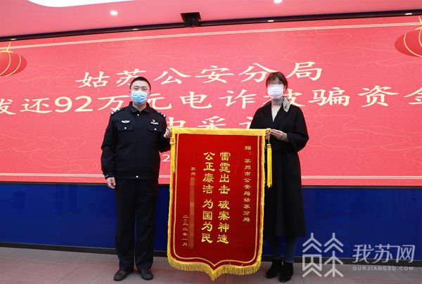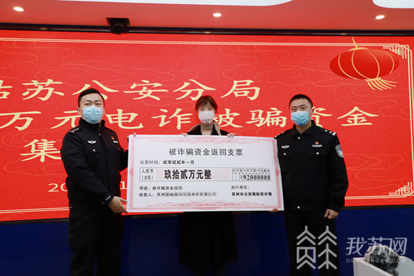 今天(1月28日)上午,苏州市公安局姑苏分局举行了一场被骗资金发还仪式,将成功拦截下的92万元资金返还给了被骗公司负责人张女士,这是该局2021年的最后一笔被骗返还资金,同时也是金额最高的一笔。