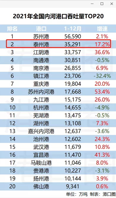 喜报!日前交通运输部发布了2021年全国内河港口吞吐量前20名榜单,其中泰州港以3.5亿吨的吞吐量跃居全国第2位同比增幅17.2%!!!