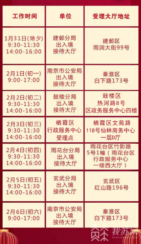 昨天(1月27号)下午,南京警方发布了春节期间,出入境管理部门对外办公时间表。