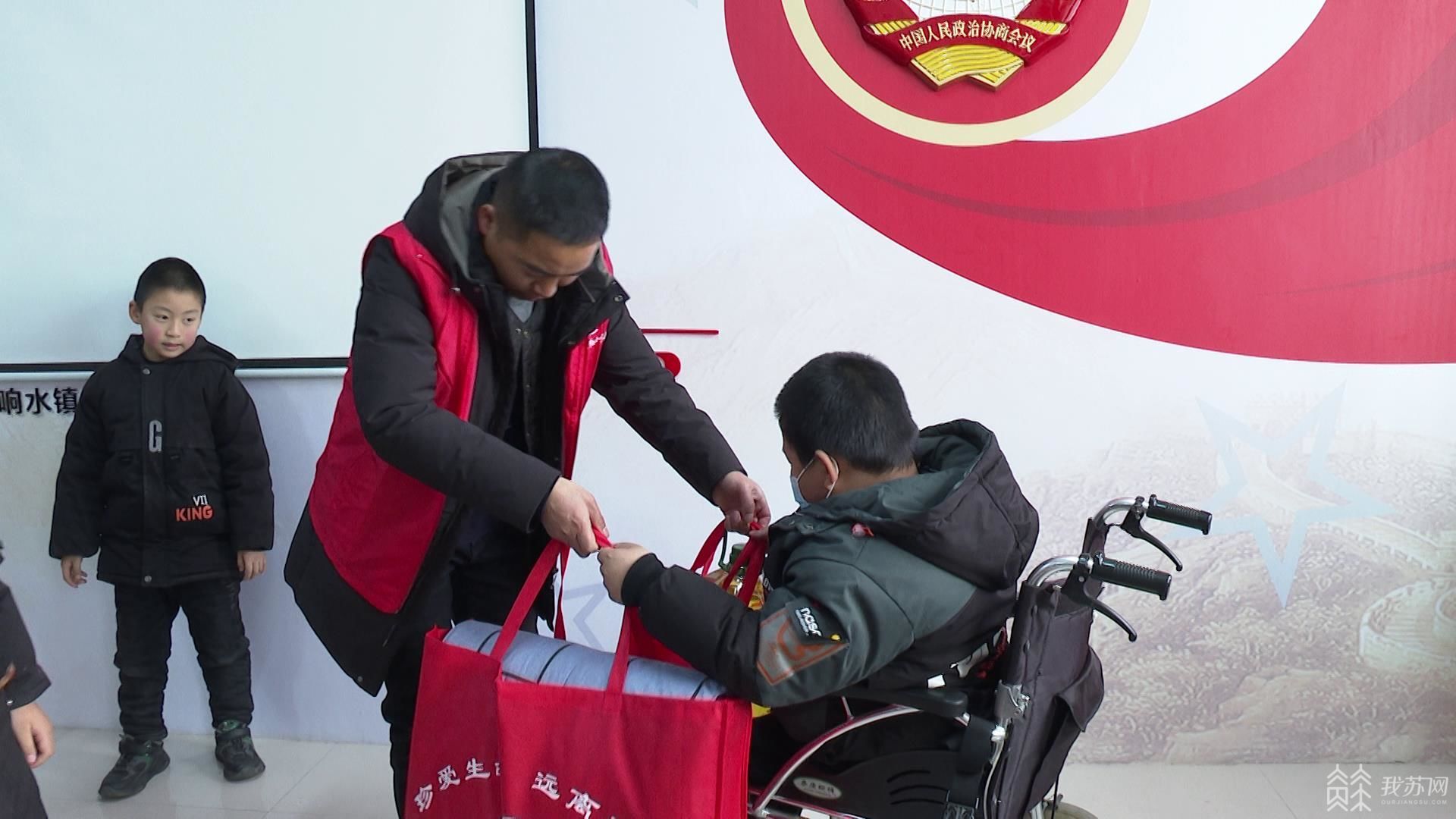 1月24日下午,该县红十字会志愿者在响水镇城南居委会会议室里,举行新春慰问仪式,为来到现场的35户困难家庭送上棉被、食用油、保暖衣等“春节温暖礼包”。