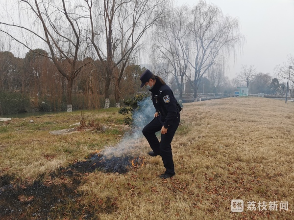 到了现场,道路旁一大片绿地被烧得焦黑,浓烟弥漫在空气中,因为风力较大,若不控制,近500米的绿化带和电缆都将受到威胁,为防止火势蔓延,杨蓉蓉赶忙用脚踩灭外圈的火苗。队员们立即从后备箱取出干粉灭火器扑救。一分钟不到,消防员也来了,在大家的共同努力下终于将火扑灭。有意思的是,消防员和杨蓉蓉互相道谢。