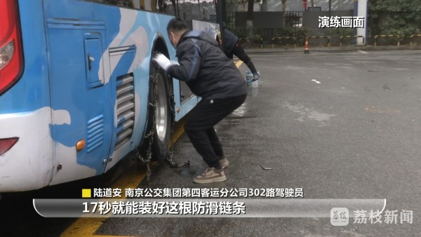 南京公交集团第四客运分公司302路驾驶员陆道安告诉记者:“在这之前,我们车队已经组织过应急演练。我以最快的速度,17秒就能装好一根防滑链条。”