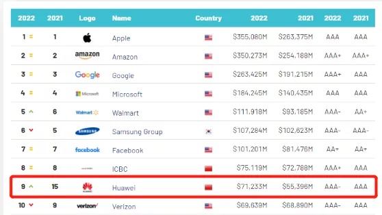 美实施“禁令”后,国际咨询机构最新发布:华为2022年品牌价值排名升至全球前10!