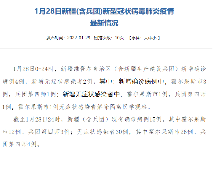 截至1月28日24时,新疆(含兵团)现有确诊病例15例,其中霍尔果斯市12例、兵团第四师3例;无症状感染者30例,其中霍尔果斯市26例、兵团第四师4例。