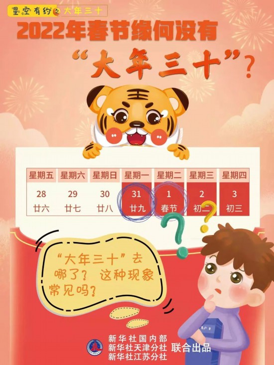 具体来说,由于恰逢29天的小月,所以即将到来的农历壬寅虎年春节前一天的“大年三十”就被“省略”了;由于是恰逢30天的大月,接下来的农历癸卯兔年春节前一天的“大年三十”就没有“缺席”。