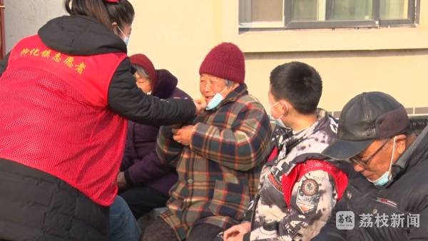 晚饭结束后,志愿者们陪老人聊天、吃水果,还为他们送上了红色围巾,并合影留念。