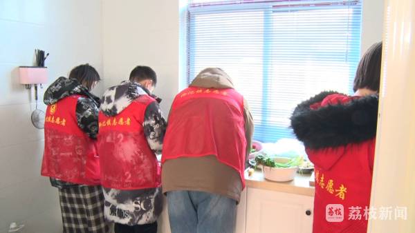 记者在涧河社区的兜底保障房前看到,几名社区党员志愿者正在门前悬挂红灯笼,为老人布置房间,增添春节气氛。与此同时,屋内也升腾起浓浓的“烟火气”,大家分工明确, 择菜、洗菜、烧鱼……各展所长,忙得不亦乐乎。