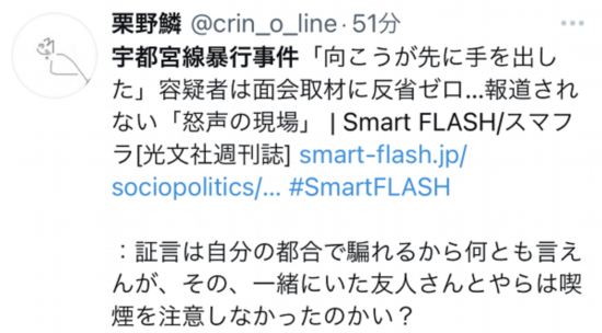 《FLASH》的最新采访内容再次让这起事件成为日本网络上的讨论热点,针对宫本的说辞,有日本网民称:“最基本的,别在车内吸烟,这都不需要别人来提醒。”