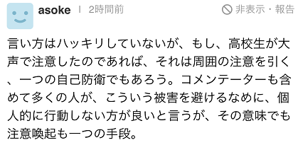还有人分析称:‘如果高中生警告时很大声,这可能也是为了吸引其他人的注意,是一种自我防卫。“