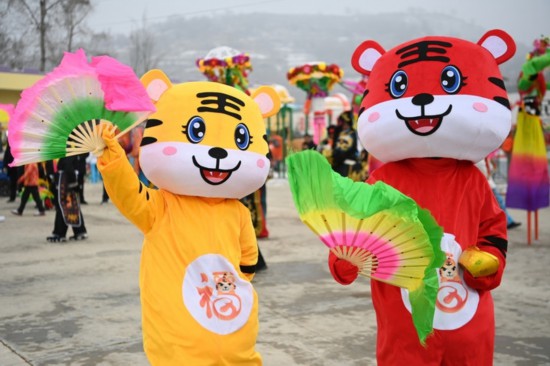 2022年1月26日,在和政县陈家集镇陈家集村,村民表演扭秧歌。新华社记者 范培珅 摄