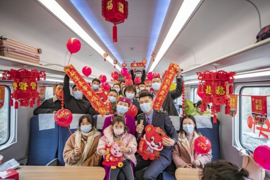 2022年1月28日,在重庆西北环线C451次列车上,中国铁路成都局集团有限公司重庆客运段和重庆铁路公安处的青年职工与旅客一起合照。新华社记者 黄伟 摄