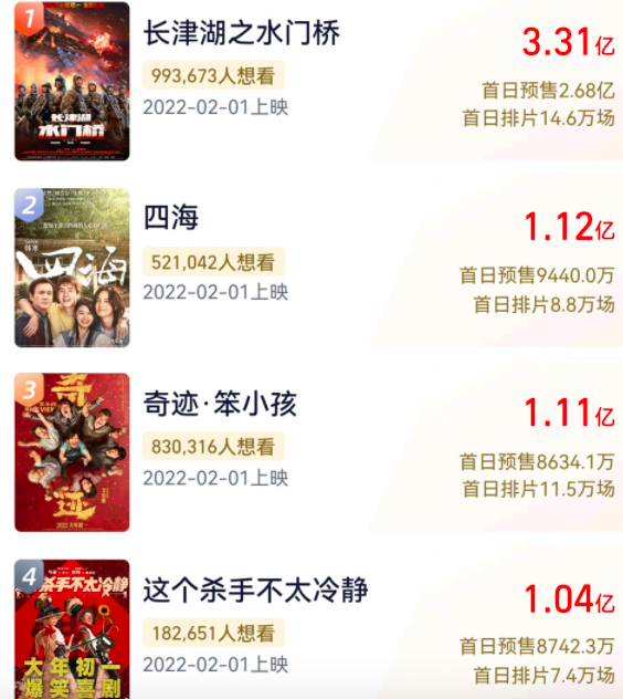此外,在大年初一(2月1日)的单日票房方面,《长津湖之水门桥》《四海》《这个杀手不太冷静》分列前三名。其中《这个杀手不太冷静》上升趋势不错,在当日排片和场次落后于《奇迹·笨小孩》的情况下,单日票房却实现了反超。