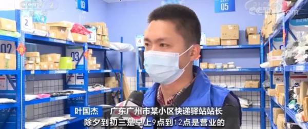 广东广州市某小区快递驿站站长 叶国杰:春节期间照常送货上门,除夕到初三是早上9点到12点营业,其它时间是早上9点到下午4点营业。