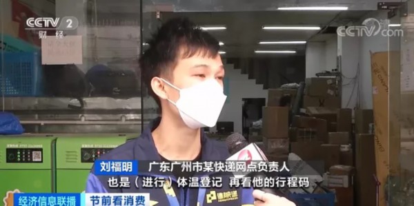 广东广州市某快递网点负责人 刘福明:国际件有专门的人员派送,这些国际件派送人员每一周都要进行核酸检测,每天上班前第一时间体温登记,然后看他的行程码