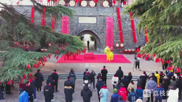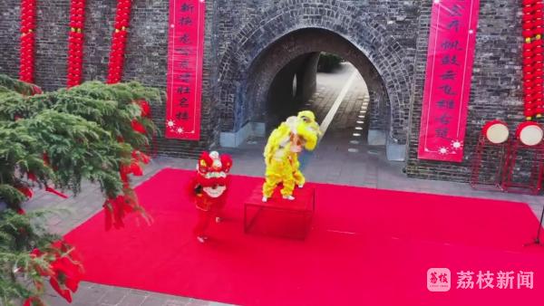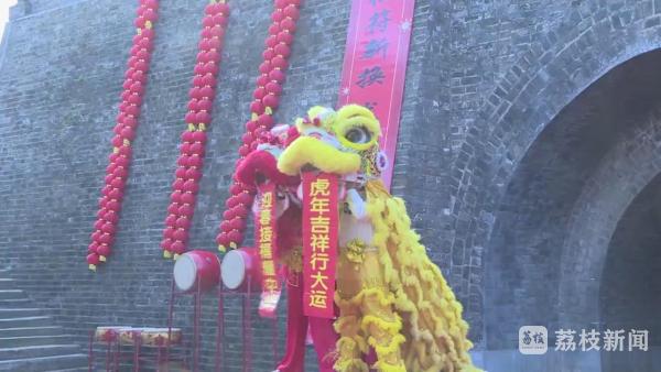 古朴的镇淮楼城门上悬挂起巨幅对联,彩色的狮子在城楼下龙腾虎跃,摇头摆尾,营造出浓浓的喜庆氛围。
