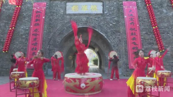 身穿红色古装的清丽女子,进行了盛世中华击鼓表演,密集的鼓点,欢快的长袖舞蹈,让广大市民感受到新春的喜悦。新年的第一天,人们走上绵延800余年的镇淮楼上,敲钟祈福,祝愿家庭和和美美,祝愿祖国繁荣富强。