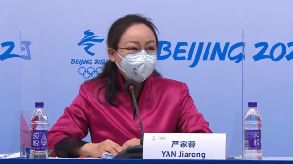 北京冬奥组委新闻发言人严家蓉身着玫红色的唐式礼服