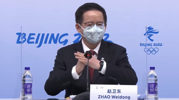 北京冬奥组委新闻发言人赵卫东用中国传统拜年手势向中外记者拜年