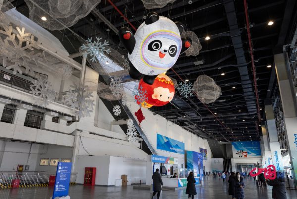 主媒体中心的一楼大厅上方,北京冬奥会吉祥物冰墩墩和冬残奥会吉祥物雪容融悬挂其间。代表中国传统文化元素的纸鸢,也带来了春天的气息。