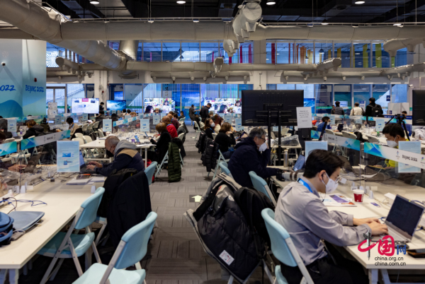 此时此刻,敲击键盘的声音此起彼伏,各种语言的交流回响耳畔,中国和北京冬奥的故事、声音从这里发出,传向世界。