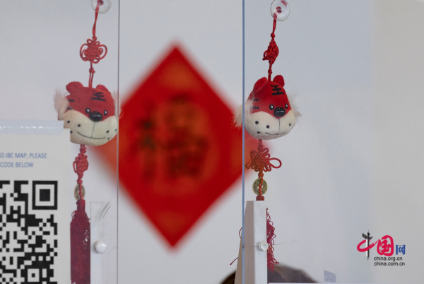 新闻服务台挂上了布老虎,贴上了春联,展现着中国春节的喜庆氛围,对于不能回家和亲人们团圆的志愿者来说,这个春节尤为特殊,又十分难忘。