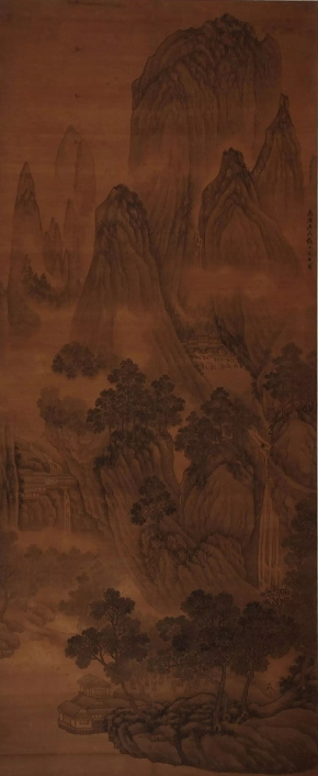 吴彬,字文中,号枝隐头陀,擅长山水和人物,为明中晚期著名宫廷画家,这件《百道飞泉图轴》便是作者的中年时期的一件代表作。画面采用高远构图,图中层峦叠嶂,云雾缭绕,山峰耸峙,飞泉流淌,连绵不绝的山山水水,都浓缩在六尺长的绢素之中。