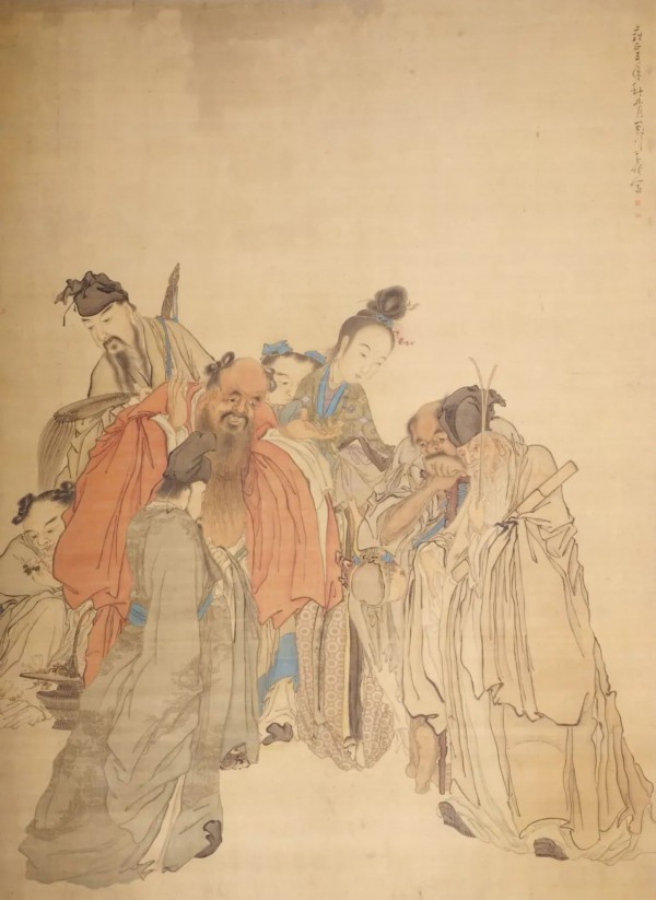 黄慎,初名盛,字恭寿,号瘿瓢子,扬州八怪之一。这幅《八仙图轴》是其画于清雍正五年,《八仙图》画幅巨大,保存完好,色彩丰富,用笔细致,是国内少见的黄慎巨幅工笔人物画之一。