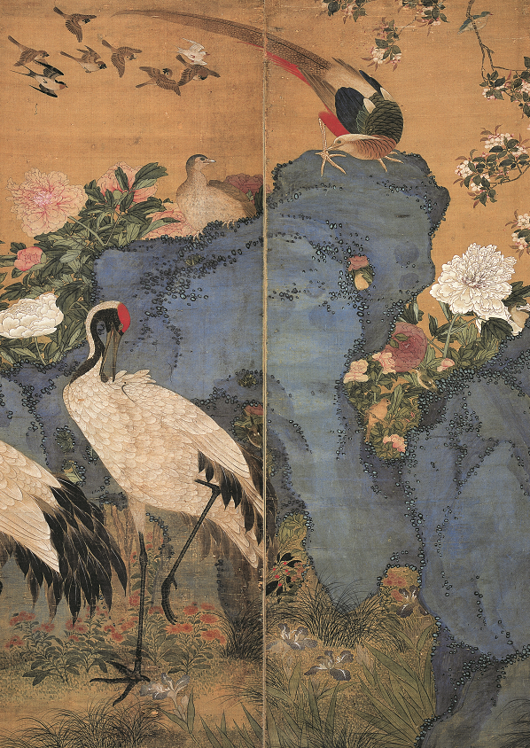 此通景画由乾隆年间宫廷画家马琼等六人合作而成。场景壮观,设色艳丽,画工精细,形象生动。画面以白玉兰、桃花、牡丹为主,间以紫藤、蔷薇、翠竹、兰花、鸢尾花、金钱菊等,孔雀、丹顶鹤、山雉、绶带鸟、鹦鹉和八哥等鸟儿各展身姿,呈现出一片勃勃生机。