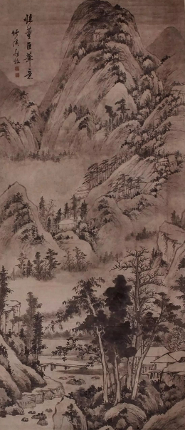《仿董巨山水轴》为清江西派画家罗牧的传世巨幅精品之一。画中用水墨手法描绘出高山大岭,万木繁茂,秋意浓郁的景象。溪岸板桥,屋宇俨然,林木掩映;山峦突兀,云气缭绕,气象万千。