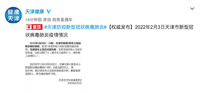 荔枝新闻讯 据天津健康微博消息,2022年2月2日0-24时,天津市新增9例本土新冠肺炎确诊病例。新增1例境外输入性新冠肺炎确诊病例。无新增本土无症状感染者,无新增境外输入无症状感染者。治愈出院17人(其中本土病例11人,境外输入病例6人)。
