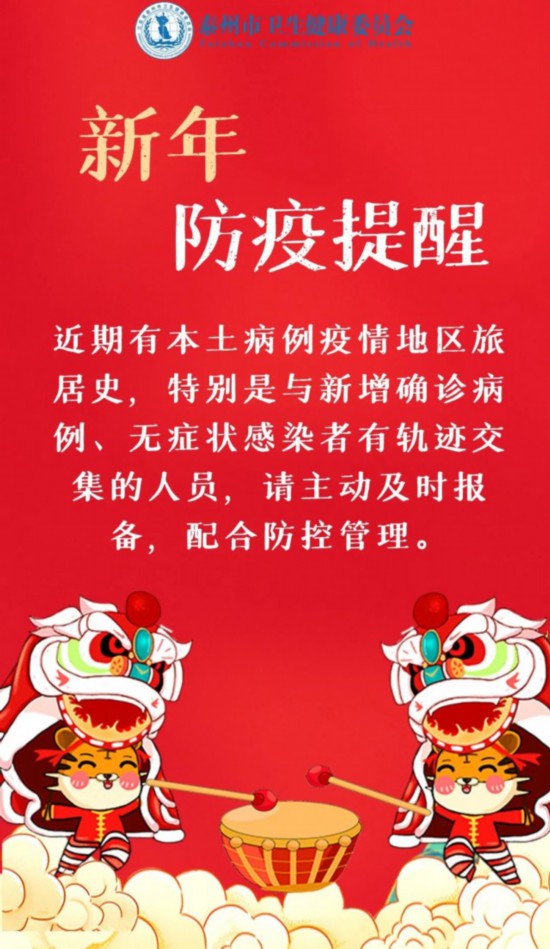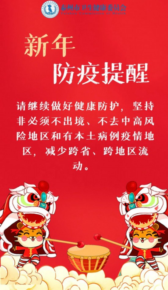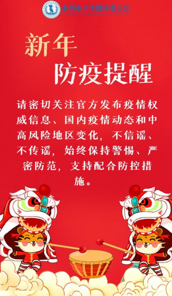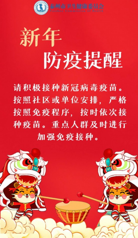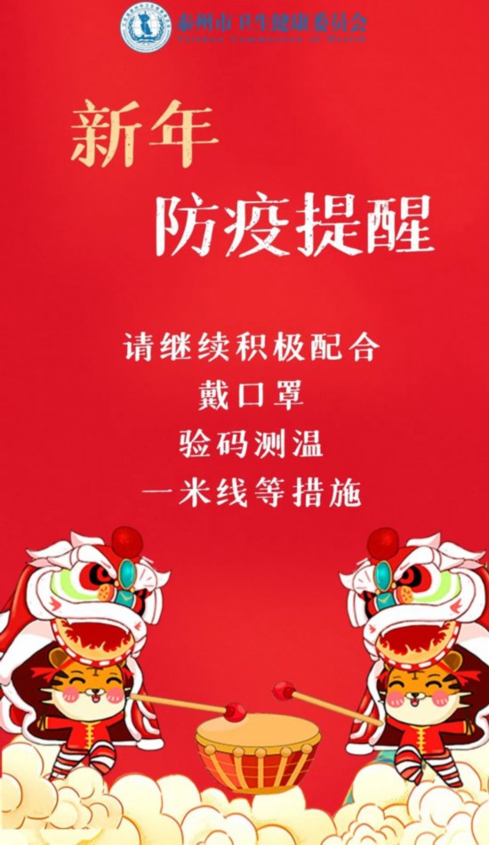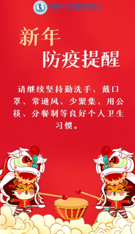 拜年啦!拜年啦!今天是正月初三,天气晴好,正是走亲访友相互拜年的好日子。泰州市卫健委最新一波新年防疫提醒也已经送达,快来看看有哪些: