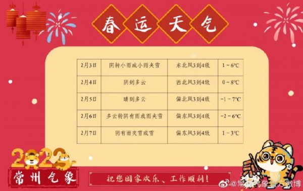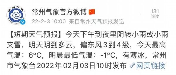 根据@常州气象,预计未来五天,我市3日、6日后期到7日还有两次雨雪过程。