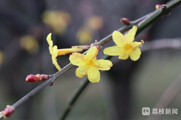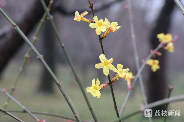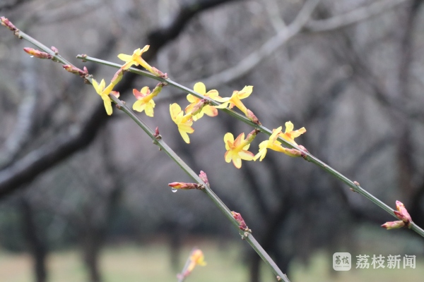 走在梅林间的小路上,一簇又一簇墨绿色的枝条自由地伸展,垂成拱桥般的形状,茂密而整齐。枝条上开始长出一些小花苞,星星点点的,好似画家用彩笔在枝条上信手点了几笔。花苞有的已经完全绽放,有的只微微张开,还有的完全包合,小巧而嫩黄。“今年的迎春比往年早开了十天左右,估计和前期的温度偏高有关。”园林工人介绍说。