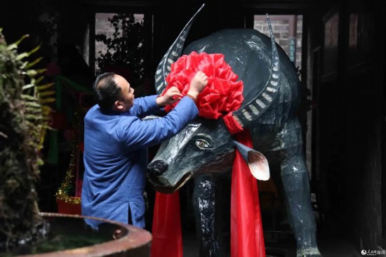 滕勇为“春牛”带上红花。人民网-湖南频道 向宇 摄