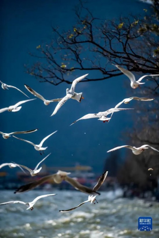 2月1日,云南昆明,红嘴鸥在海埂公园飞翔。新华社记者 陈欣波 摄