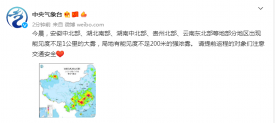 今晨,安徽中北部、湖北南部、湖南中北部、贵州北部、云南东北部等地部分地区出现能见度不足1公里的大雾,局地有能见度不足200米的强浓雾。