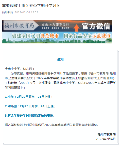 荔枝新闻讯 据“福州教育”微信公众号2月4日消息,福建省福州市调整中小学、幼儿园2022年春季学期开学时间。