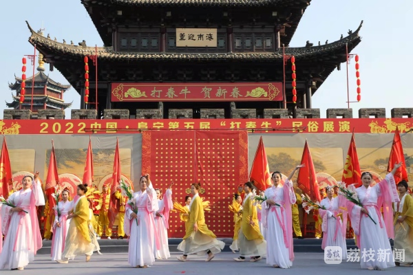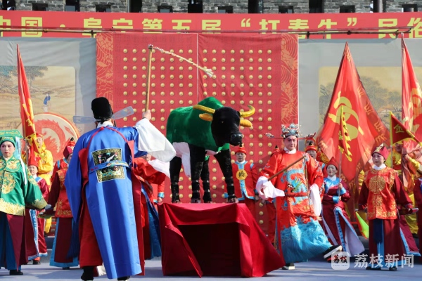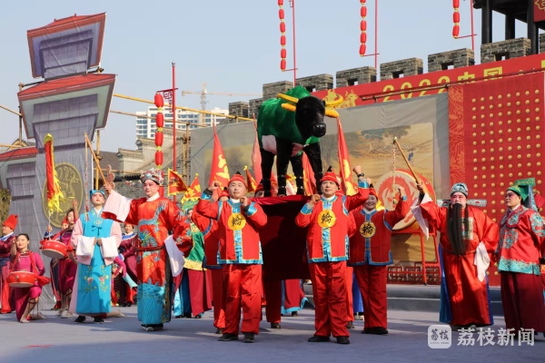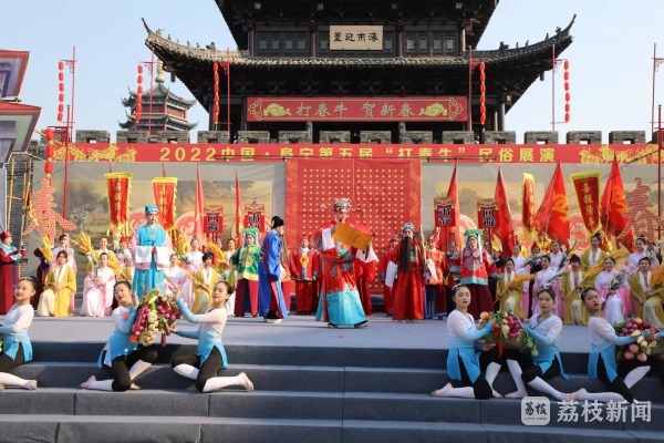 2月4日是农历 " 立春 "。一大早,盐城阜宁县庙湾古城广场上人潮涌动,阜宁第五届 " 打春牛 " 民俗展演热闹上演。随着执礼官的口令,头顶乌纱、身着官袍的" 县官 "们带着乡民围绕春牛,执鞭打牛,提醒人们春耕即将开始,莫误农时,台下观众纷纷叫好。