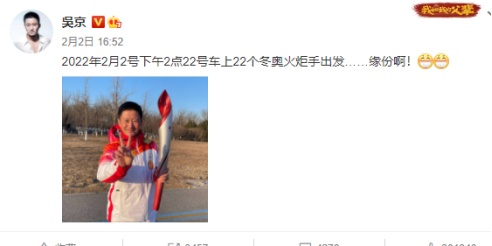 值得一提的是,吴京担任了此次北京冬奥会火炬手。他2月2日曾在微博上发文称,“2022年2月2号下午2点22号车上22个冬奥火炬手出发……缘份啊!”