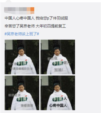 由于是冬季奥运会,还有暖心网友为吴京的照片P上了一件羽绒服。
