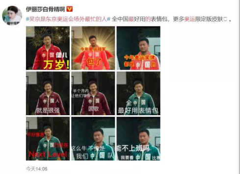在去年东京奥运会上,吴京的表情包曾以始料未及的速度在中国社交媒体微博上开始霸屏。有网友笑说这也许是东京奥运会期间“全中国最好用的表情包”,并奉上了“更多奥运限定版皮肤”。