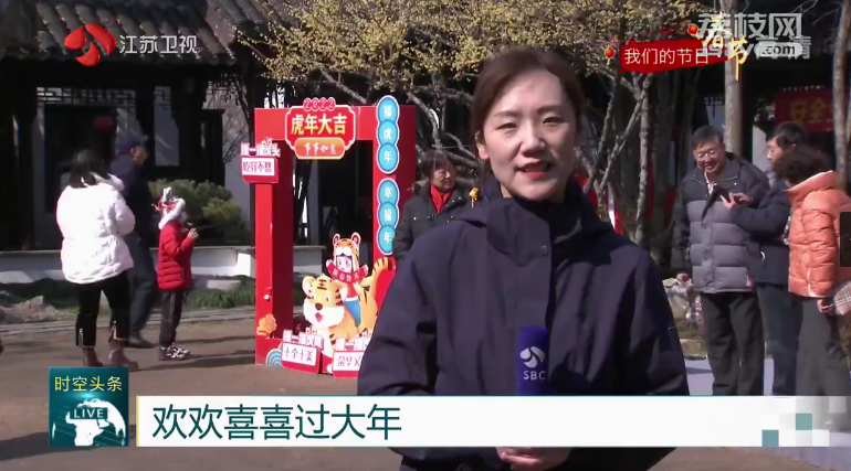江苏台记者朱晓莹说:“这里是南京民俗博物馆,虎年春节,一系列以‘虎’为主题的民俗活动在这里精彩亮相。既有年画、织绣、瓷器这样的民间艺术品,也有不少非遗传承人现场展示虎头帽、老虎花灯的制作‘绝活’,可以说是年味满满,格外热闹喜庆。”