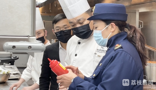 2月4日上午,记者跟随南京江宁区市场监督管理局汤山分局局长蒋伶俐来到江苏园博园内进行节假日例行检查。首先检查的是一家酒店,尽管该酒店在卫生、消杀、分类以及添加剂保管方面都做得十分规范,但在检查的过程中,一些细节方面,执法人员还是提出了整改的建议。
