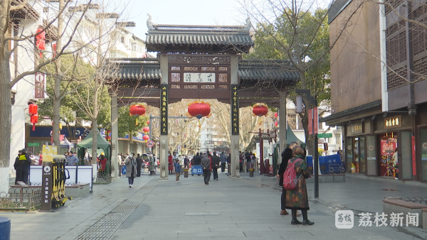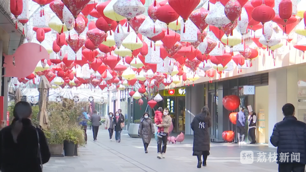 在南京夫子庙景区,大红灯笼把景区装点得分外喜庆。不少商家店铺都选在今天开门营业。小吃店经营户说:“今天大年初五,我们也是早早开门来营业,然后生意一直都没有断过。不错的,希望我们的生意越来越红火。”