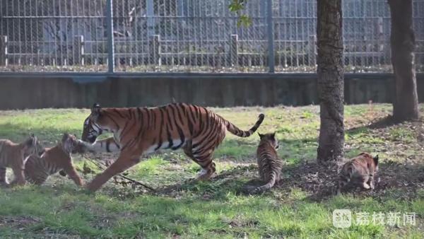 华南虎是我国独有的虎亚种,属于国家一级保护动物,目前全国仅存200多只,且都是人工饲养。而苏州这只3岁大的年轻虎妈,头一回生宝宝就生了4只,还会主动哺育幼虎,比如喂奶、舔舐、护崽,认真负责,可以说是相当优秀了!小家伙们围着虎妈身边撒娇打滚和虎妈妈嬉戏打闹,萌态十足,又不失虎虎生威的风采。如果隔着栅栏太远看不清,市民还能通过一旁的大屏幕直播换个视角看憨态可掬的它们。