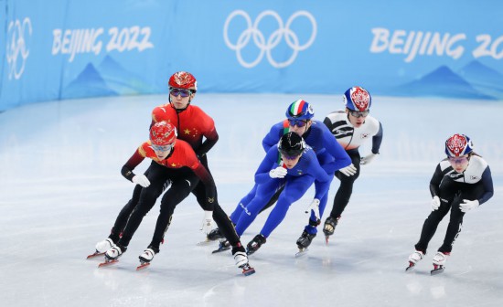 2月5日,中国队选手范可新(左前)与队友武大靖(左后)在比赛中。当日,北京2022年冬奥会短道速滑项目混合团体接力四分之一决赛在首都体育馆举行。新华社记者杨磊摄