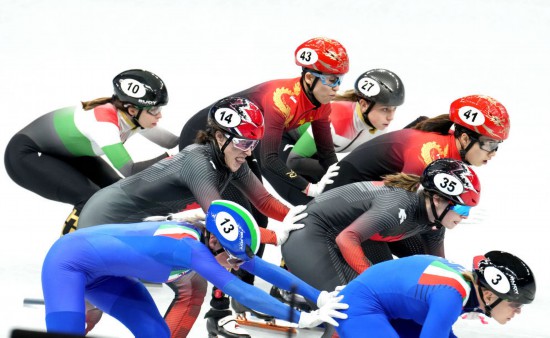 2月5日,中国队选手曲春雨(右二)与队友张雨婷(左三)在比赛中。当日,北京2022年冬奥会短道速滑项目混合团体接力半决赛在首都体育馆举行。新华社记者李尕摄