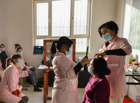 2021年12月13日,在新疆莎车县城北街道,居民参加美容美发技能培训。冬闲时节,莎车县开展“科技之冬”培训活动,帮助当地居民提高职业技能水平。新华社记者 丁磊 摄