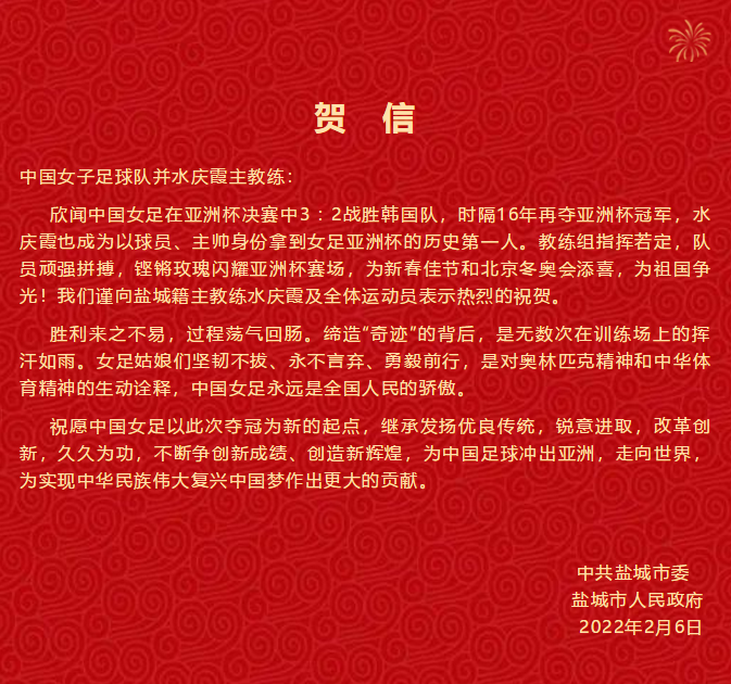 2月6日晚,中国女足上演逆转绝杀奇迹,在亚洲杯决赛中3:2力克韩国队,时隔16年再夺亚洲杯冠军!水庆霞教练的家乡盐城发出贺信,祝贺中国女足亚洲杯夺冠!