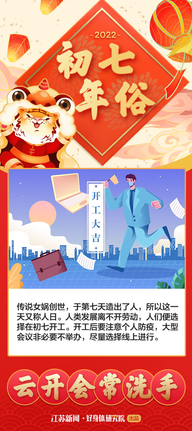 传说女娲创世,于第七天造出了人,所以这一天又称人日。人类发展离不开劳动,人们便选择在初七开工。开工后要注意个人防疫,大型会议非必要不举办,尽量选择线上进行。